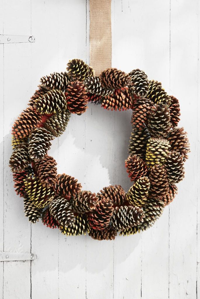 Make the Wreath: Wrap a 16-inch wreath form with burlap ribbon and loop a piece around the wreath form for hanging. Paint the tip of 40 pine cones in fall colors such as orange, yellow, and beige with acrylic paint. Brush the tips of 10 pine cones with matte Mod Podge and sprinkle with gold and copper glitter. once dry, wrap an 18-inch length of floral wire around the base of each pine cone and twist tie around the wreath form to secure, layering and overlapping them as you go.
