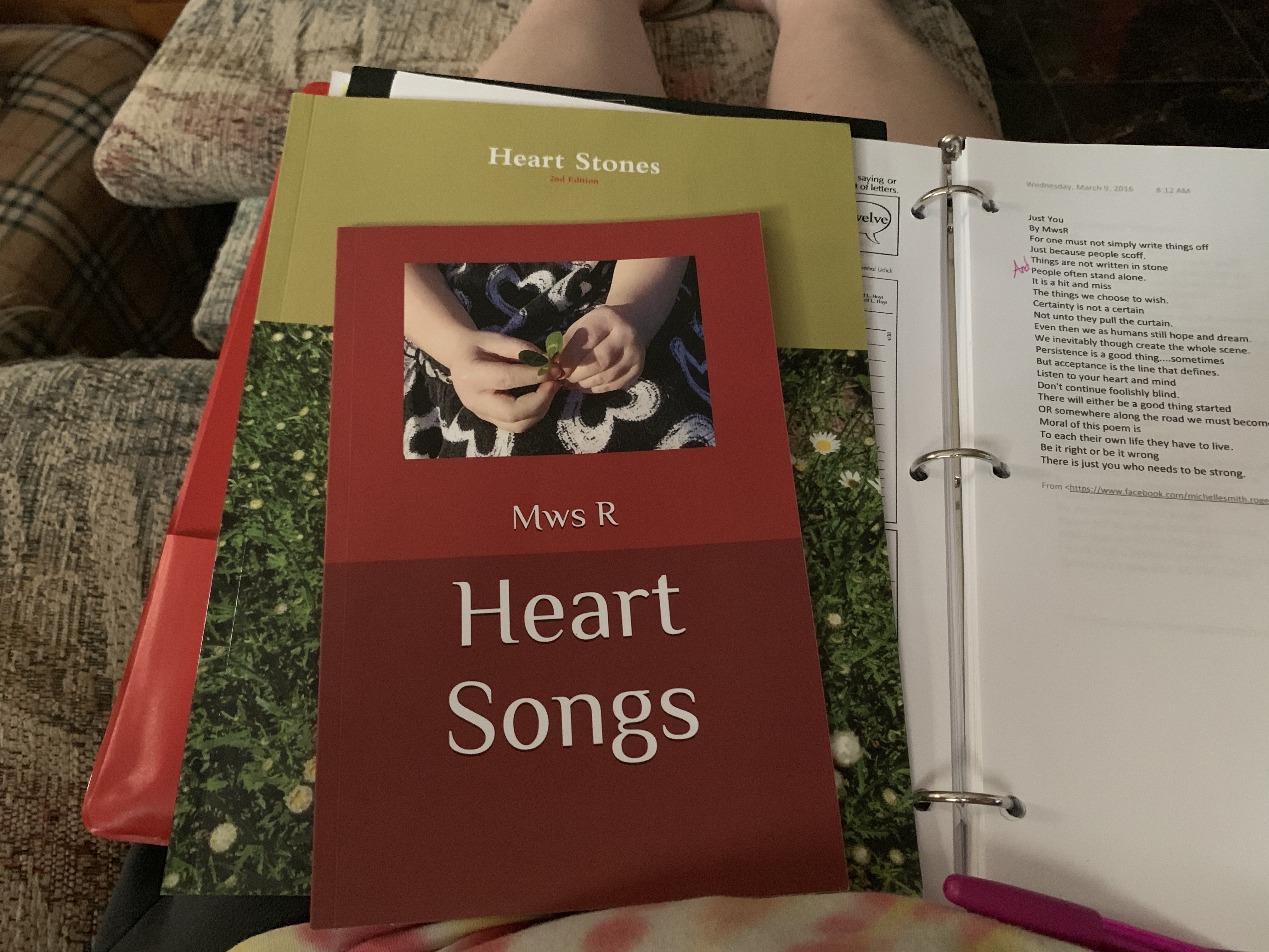 I am currently, and very slowly, working on another poetry book. I want to give insight and hope to others. My life was never easy and was not handed to me with bows and balloons, or gift wrapped even. I learned painfully and strategically how to do what I wanted and get to where I needed to be, to feel safe and loved and happy. Still, actually, I am working on it with each day. It is a thing that takes time and work.